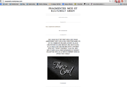 Det drejer sig om Jørgen Riis’ forskellige Spectatorer (1744-45), Johan Elias Schlegels Der Fremde (1745) og L.A. de la Beaumelles Spectatrice danoise (1748-50). Der var særlig i Riis’ tilfælde tale om kortlivede publikationer, der hurtigt gik ind, men lige så snart dukkede op igen under nye titler: Den Danske Spectator samt Sande- og Gransknings-Mand, Den danske Anti-Spectator eller Een for Alle imod den Danske Sande-Mand og Den danske Spectators philosophiske Spectator. Det minder om dynamikken i blogosfæren. For et års tid siden slettede Caspar Eric alle sine indlæg på bloggen FRAGMENTER MOD ET KULTURELT ARKIV, og kun et kort statement er tilbage: ‘Jeg har slettet det hele’. Kort efter er der postet et link til en nystartet tumblr-blog ‘Dage i vores liv‘.